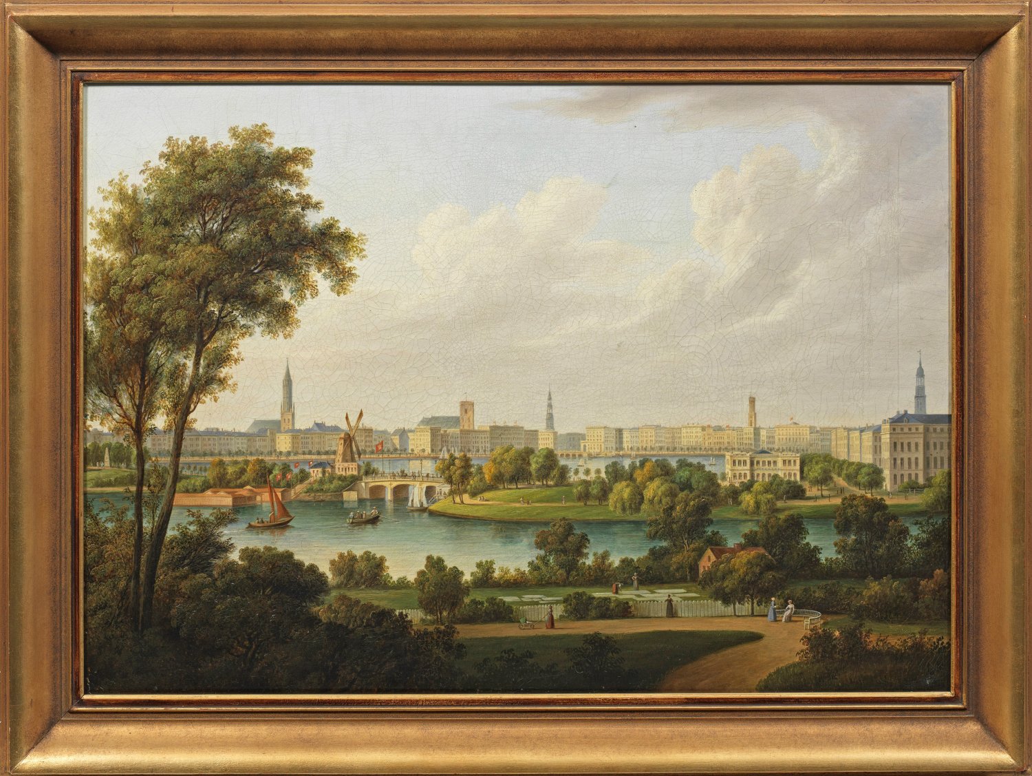 Detailreiche, atmosphärisch gestimmte, spätbiedermeierliche Vedute mit minutiös feiner Architekturdarstellung. Die historisch bedeutende, um 1850-1860 entstandene Ansicht von Hamburg mit der wiederaufgebauten Stadt nach dem großen Stadtbrand von 1842 gehört zu den raren Gemälden des Künstlers. Heuer gilt als einer der besten Zeichner und Grafiker seiner Zeit im norddeutschen Raum; nach seiner Lithographen-Ausbildung bei den Gebrüdern Suhr studierte er in der zweiten Hälfte der 1830er Jahre in Wien und kehrte 1842 in seine Heimatstadt zurück. In seinen Ansichten aus Hamburg und seiner Umgebung verband er topographische Exaktheit mit einem ausgeprägten Gefühl für malerische Farbwerte. Öl/Lwd., auf Holztafel kaschiert. Verso altes Etikett der Galerie Commeter, Hamburg, mit Bez. "Wilh. Heuer Blick auf Lombardsbrücke und Jungfernstieg". 57 cm x 81 cm. Rahmen.