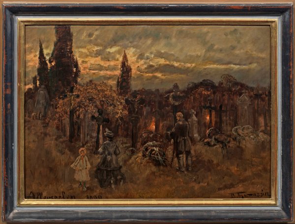 Impressionistische, abendliche Szene mit einer Familie an den von Kerzen bzw. Laternen erhellten Gräbern eines stillen Friedhofs. Thomassin, der ab 1877 in München tätig war und dort von der Dachauer Schule beeinflusst wurde, schilderte mit Vorliebe oberbayerische Stimmungslandschaften, Veduten und Szenen aus dem Landleben. Öl/Malkarton. R. u. sign.; L. u. betitelt u. dat. 1900. 46 cm x 67 cm. Rahmen.
