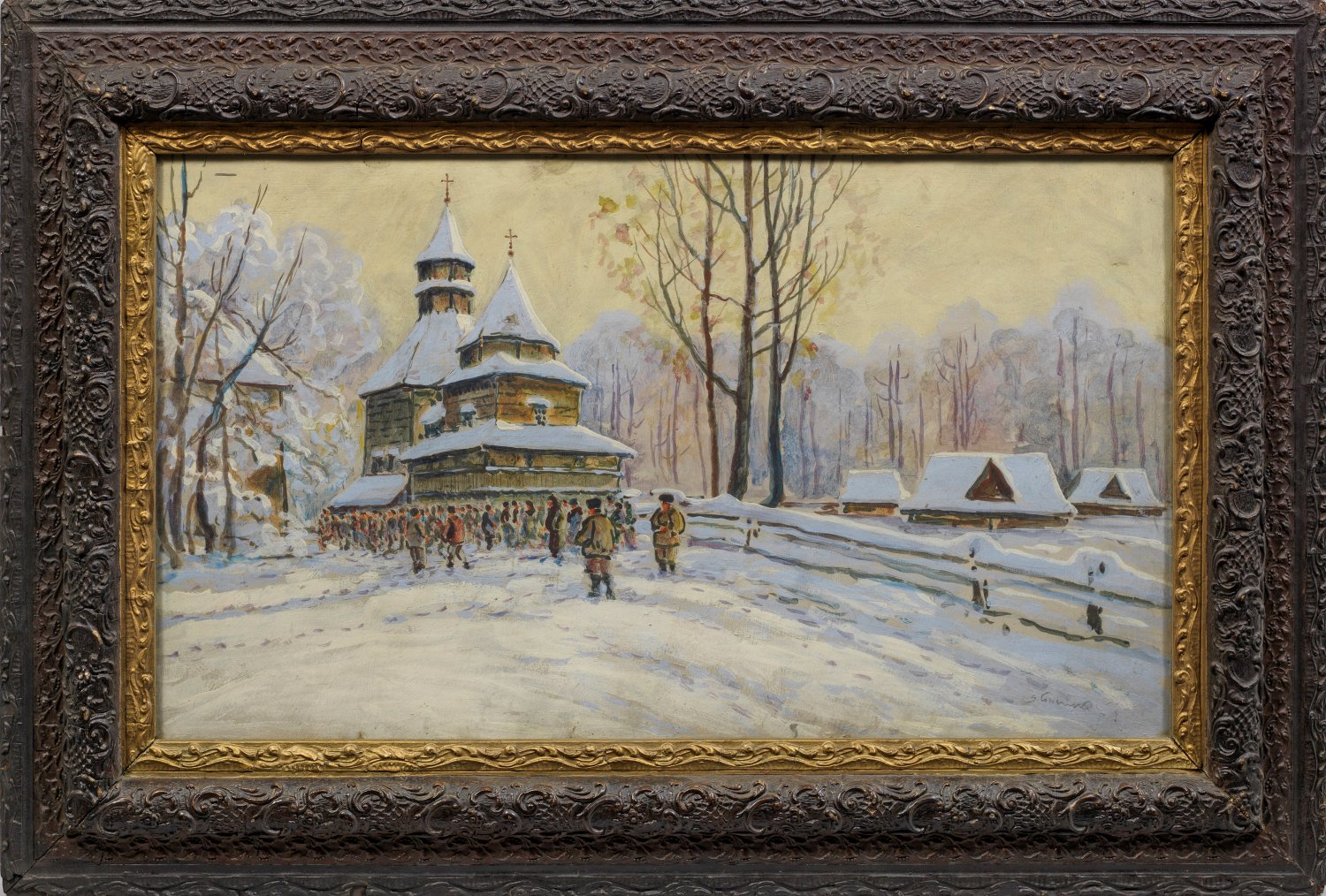 Winterliche Szenerie mit verschneiter Holzkirche in einem Dorf in Südpolen, wohl im Karpartenvorland. Stanislaw Gibinski ging 1908 nach Krakau, wo er an der Akademie unter der Leitung von Julian Falat und Leon Wyczókowski studierte. Besonders Falat übte prägenden Einfluss auf Gibinski aus, der in seinen polnischen Winterlandschaften vergleichbare Themen und dessen impressionistischen Stil aufgriff. Oft schildert er das dörfliche Leben in Polen, darunter in seiner Heimat im südpolnischen Karpartenvorland mit seinen pittoresken Holzkirchen. Nach genauen, vorhergehenden Studien vollendete der Künstler seine meist in Aquarell- und Gouachetechnik ausgeführten Werke im Atelier. Aquarell u. Gouache/Karton. R. u. sign.; Ca. 57 cm x 100 cm. Rahmen.