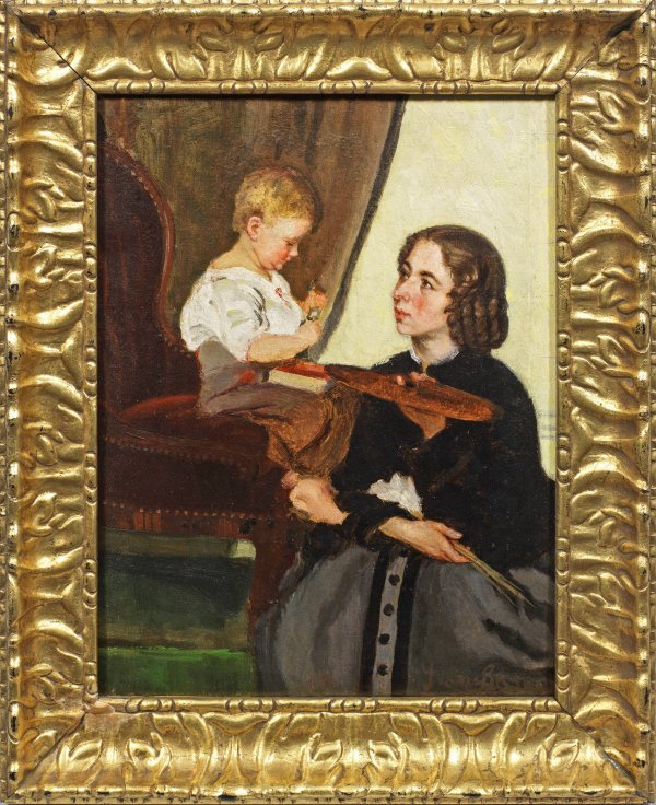 Auf einem Stuhl sitzendes, die Farben und die Palette betrachtendes Kind, vor dem die malende Mutter kniet und in der linken Hand ein Bündel Pinsel hält. Durch die subtile Darstellung der innigen Vertrautheit künstlerisch qualitätvolles Gemälde, das auch durch das außergewöhnliche Motiv herausragt: Bis Anfang des 20. Jhs. gehörten Malerinnen zu den Seltenheiten, zumal sie nicht an staatlichen Akademien, sondern nur an privaten Akademien und Malschulen bzw. von Malern als Schülerinnen aufgenommen wurden und als sog. "Malweiber" diffamiert wurden. Eine der Ausnahmen bildete die bedeutende dänische Malerin Caroline Emilie Mundt (1842 - 1922), die 1893 ein vergleichbares Selbstbildnis mit Kind schuf. Öl/Lwd., auf Holztafel kaschiert. R. u. undeutl. sign.; 39,5 cm x 31 cm. Rahmen.