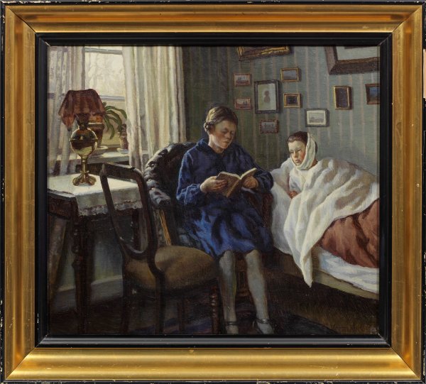 Anekdotisches Interieurbild des dänischen Genre- und Interieurmalers, der wie kaum ein anderer in seinen zahlreichen Bildern Einblick in das Alltagsleben in den Häusern der dänischen Mittelschicht in der ersten Hälfte des 20. Jh. gibt. R. u. sign.; 46 cm x 52 cm. Rahmen.