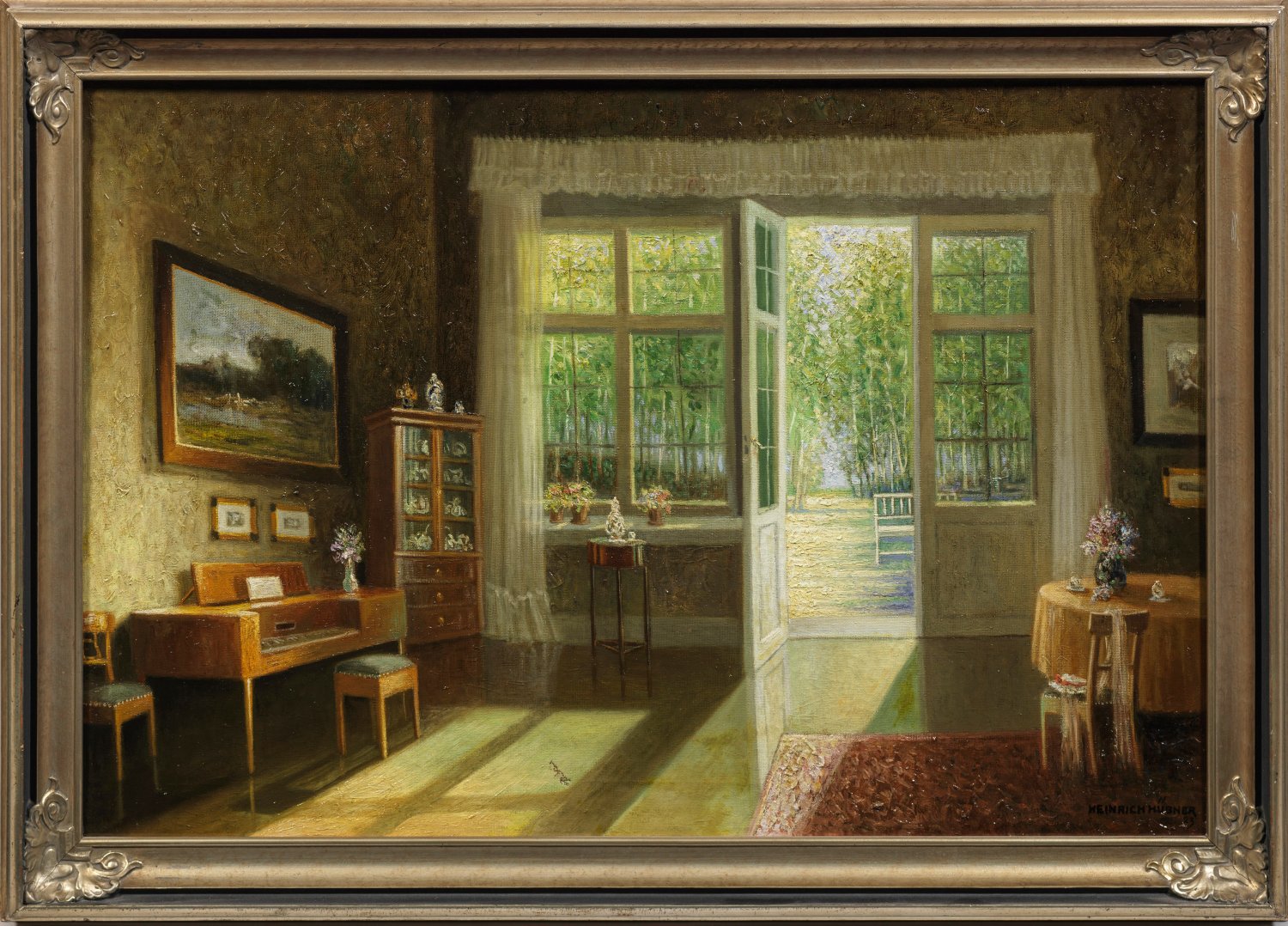 Impressionistisches, pastelltonig gemaltes, motiv- und stiltypisches Interieur- und Gartenbild Hübners. Der aus einer Künstlerfamilie stammende, in Düsseldorf ausgebildete Maler kehrte 1894 nach Berlin zurück, wo er vom französischen und deutschen Impressionsmus geprägt wurde. 1902 wurde er Mitglied der Berliner Secession, 1914 der Freien Secession. 1898-1918 beschickte Hübner die Große Berliner Kunstausstellung, 1900-1912 die Berliner Secession mit Gemälden. R. u. sign.; M. u. eine Läsur. 80 cm x 120 cm. Rahmen.