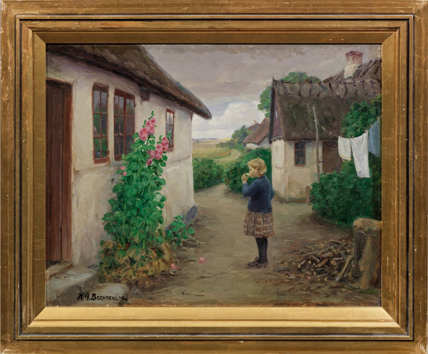 Sommerlich heiteres Werk des Künstlers, der 1884 seinen Geburtsort als Künstlernamen wählte. Brendekilde studierte an der Kopenhagener Akademie und wandte sich 1881 der Malerei zu. Er malte in den 1880er Jahren auf der Insel Fünen. Bei seinen Darstellungen des Alltags der Bauern und des idyllischen Landlebens in Dänemark wurde er von Jean-François Millet und Jules Bastien-Lepage beeinflusst. Öl/Lwd.; L. u. sign.; 34 cm x 43,5 cm. Rahmen.