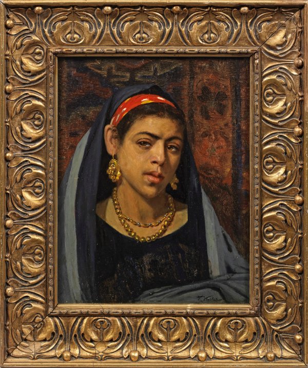 Ausdrucksvoll charakterisierendes, motiv- und stiltypisches Porträt Koslers, der vor allem in Ägypten tätig war. Kosler studierte 1881-1885 in Wien bei Christian Griepenkerl, an der Akademie und an der Spezialschule für Historienmalerei bei Leopold Carl Müller. Mit Unterstützung des Erzherzogs Franz Ferdinand besuchte er seit 1892 mehrmals Ägypten. In Kairo hatte er seine erste Kollektivausstellung, die ihn nicht nur bekannt machte, sondern ihm auch sogleich Aufträge einbrachte. Außer Porträts hochstehender Persönlichkeiten malte er vor allem Bildnisse männlicher und weiblicher Ägypter aus dem einfachen Volk, orientalische Schönheiten, Straßen- und Genreszenen. Die meisten seiner Werke wurden von englischen Sammlern erworben, da Ägypten von 1882 bis (nach) 1922 unter britischer Herrschaft stand. Öl/Mahagonitafel. R. u. sign.; 42 cm x 33,7 cm. Rahmen.