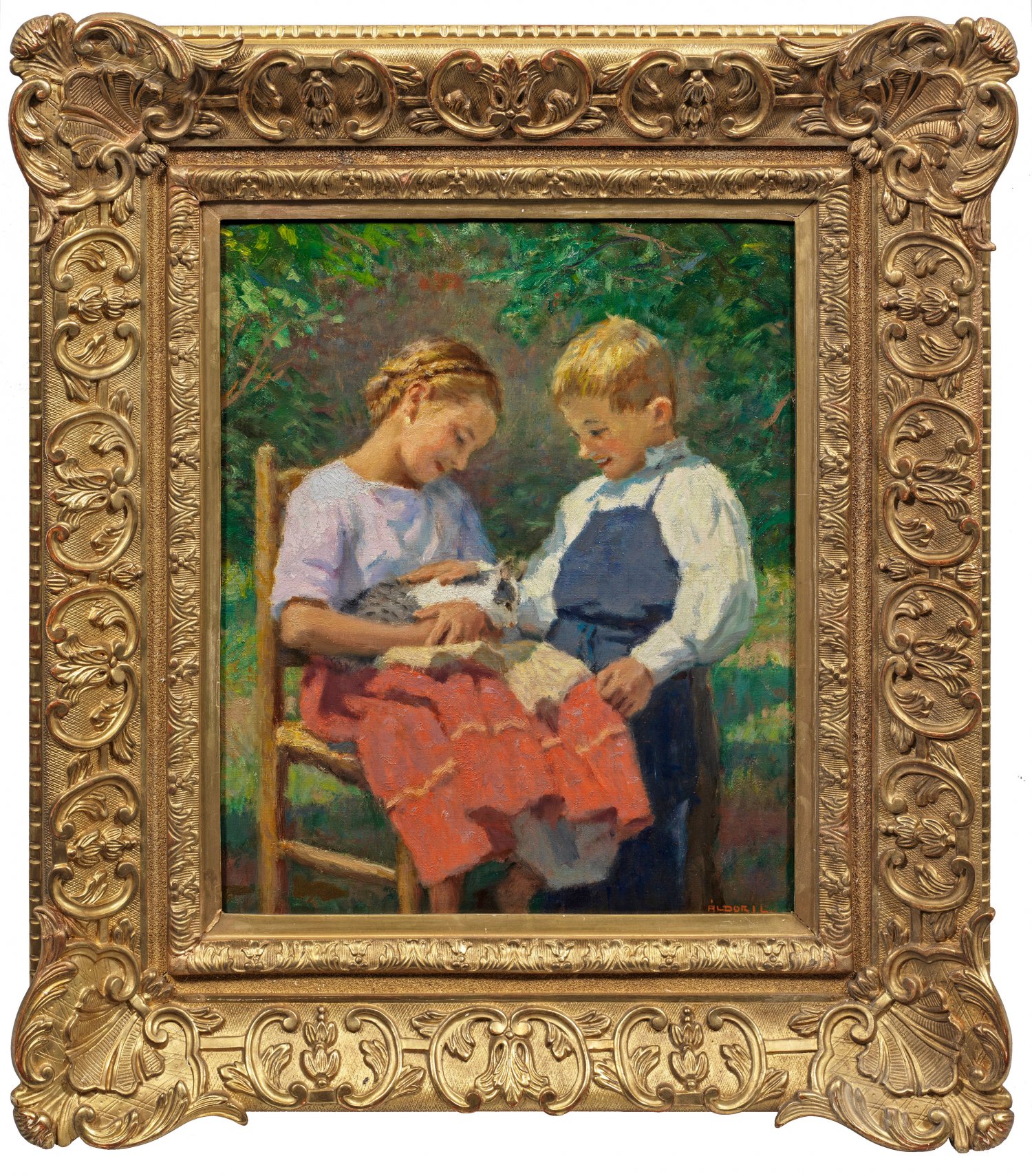 Heiteres, impressionistisches, wohl in den 1930er Jahren geschaffenes Gemälde Aldors. 1923-1925 arbeitete er in der Künstlerkolonie in Szolnok und lernte bei Adolf Fényes, Studienreisen führten ihn in den 1920er Jahren nach Paris, London und Italien. Aldor stellte seit 1924 aus und gewann 1925-1932 eine Reihe von Preisen. Außer Kindermotiven schilderte er bevorzugt weibliche Akte, ländliche Genreszenen und Landschaften aus Ungarn. Öl/Lwd.; R. u. sign.; 50 cm x 40 cm. Rahmen.