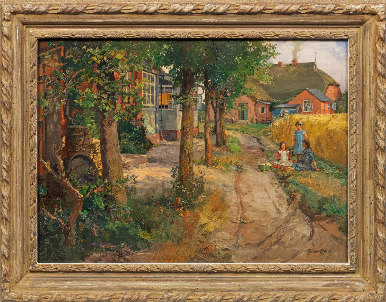 Sommerlich heitere Szene aus Norddeutschland mit drei Mädchen am Rand eines goldgelben Getreidefeldes, im Hintergrund ein rotes, reetgedecktes Bauernhaus, auf der linken Seite ein idyllisches Haus hinter Bäumen. Impressionistisches Werk Fischer-Cörlins, der an der Akademie in Berlin bei Eduard Daege und Julius Friedrich Anton Schrader studierte und sechs Jahre Meisterschüler bei Anton von Werner war. 1877-1892 nahm er an Akademie-Ausstellungen teil, ab 1893 zeigte er auf den Großen Berliner Kunstausstellungen insbesondere Landschaften, Volks- und Genreszenen aus Norddeutschland. Öl/Lwd. R. u. sign.; 50 cm x 70 cm. Rahmen