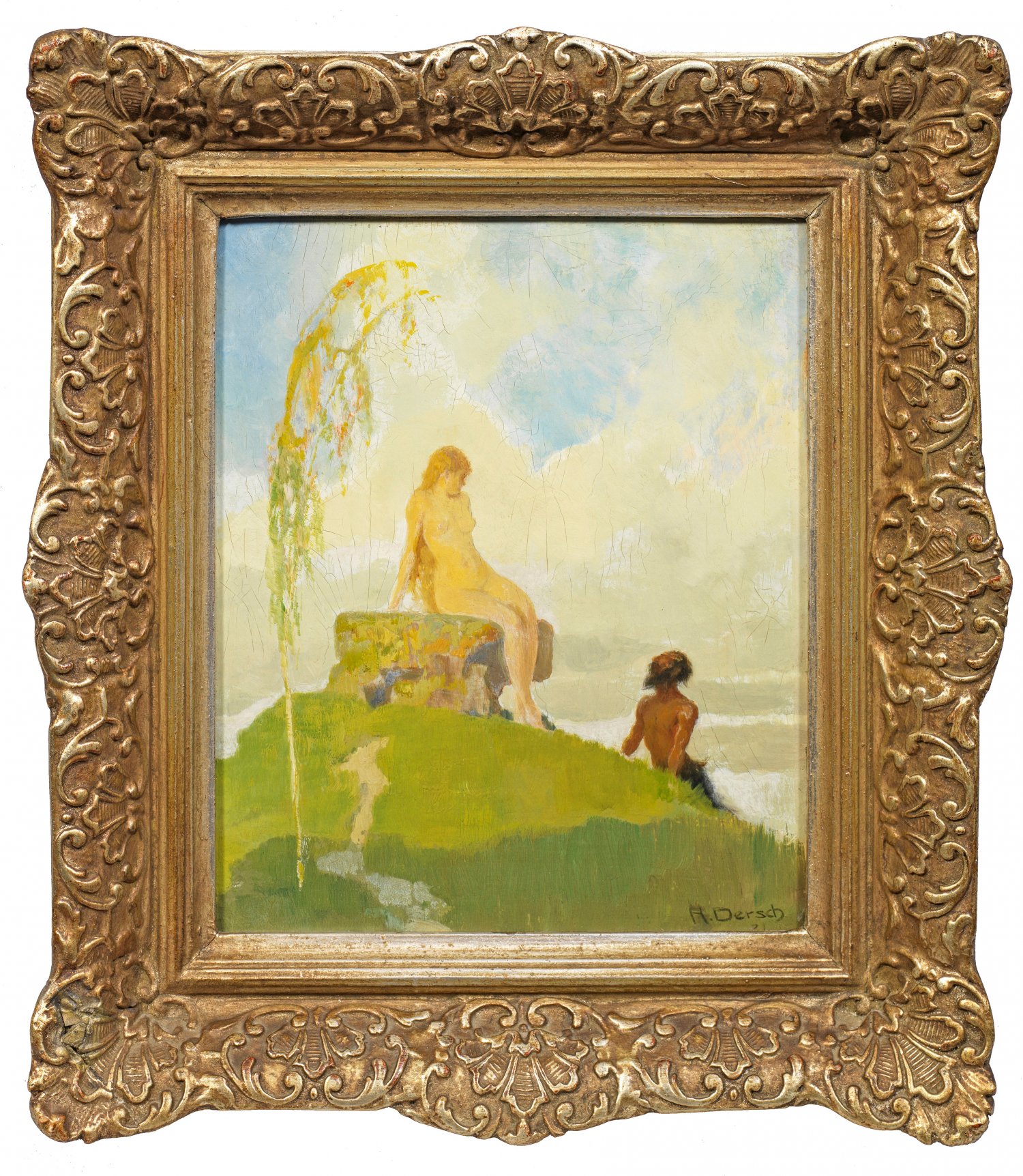 Dersch studierte an den Kunstakademien in Kassel und München. Seine vom Jugendstil beeinflußte Malerei greift hier ein Thema des Symbolismus auf und belegt eine intensive Auseinandersetzung des Künstlers in München mit dem Werk von Franz Stuck. Öl/Karton. R. u. sign. und dat. (19)21. 27,5 cm x 23,5 cm. Rahmen.