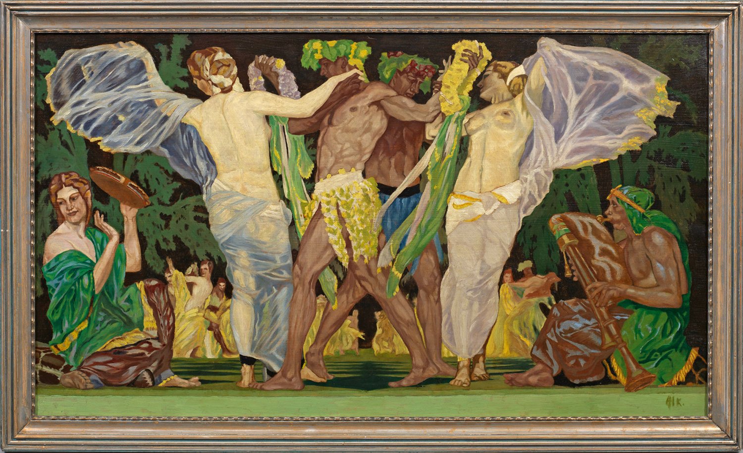 Reizvolles, für die Münchener Schule typisches Jugendstil-Gemälde. Der amerikanische Maler und Illustrator studierte 1890-1892 in München bei Ludwig von Loeffiz. 1900 und 1904 beschickte Keller die Weltausstellungen in Paris und St. Louis, wo er mit Silber- und Goldmedaillen ausgezeichnet wurde. Öl/Holztafel. R. u. monogr. "AIK". 46,5 cm x 81 cm. Rahmen.