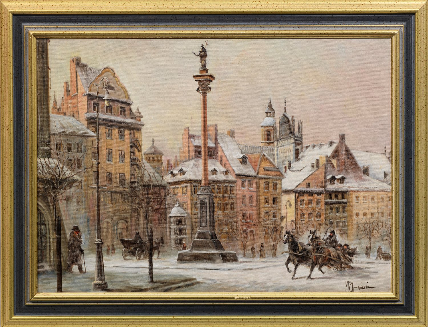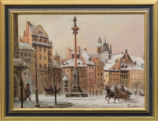 Nostalgische Vedute des verschneiten Schlossplatzes im 19. Jh. mit Pferdekutschen und Schlitten sowie Passanten, im Zentrum die hohe Sigismundsäule. Motiv- und stiltypisches Werk des bekannten polnischen Malers, dessen Hauptsujet durch Figurenstaffage belebte Stadt- und Architekturansichten, insbesondere von Warschau waren. Öl/Lwd.; R. u. sign.; 50 cm x 70 cm. Rahmen.