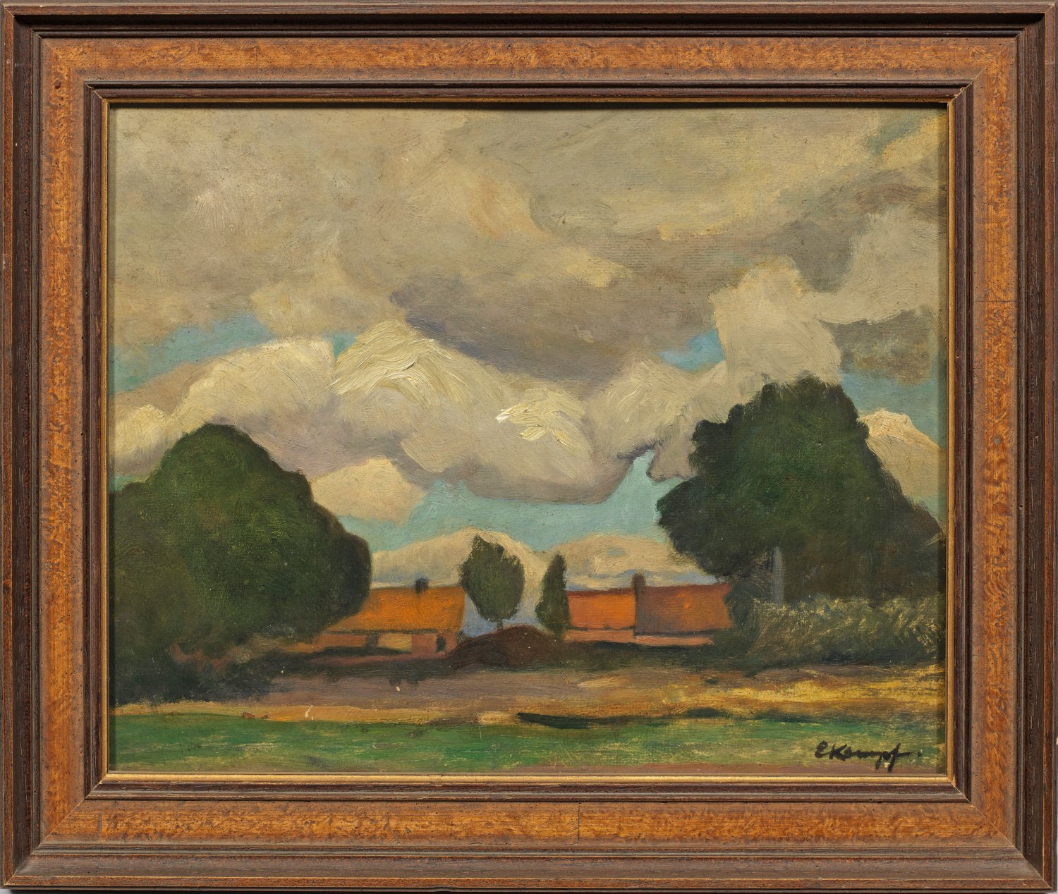 Impressionistisches Werk mit expressiver Tendenz zur Formvereinfachung des Landschaftsmalers, der mit Vorliebe flämische, niederrheinische und holländische Motive schilderte. Kampf, der 1908 Akademieprofessor wurde, beschickte seit 1880 die bedeutenden nationalen und internationalen Ausstellungen, u. a. in München und Berlin sowie 1900 die Weltausstellung in Paris. Öl/Lwd., aufkaschiert. R. u. sign.; 27 cm x 35 cm. Rahmen.