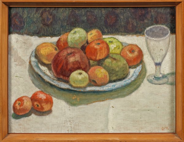 Das im Winter 1917/18 entstandene Stillleben mit seinen auf einer weißen Tischdecke und auf einem Teller arrangierten Äpfeln, neben die Modersohn ein Glas stellte, ist zugleich eine unmittelbare, intensive Auseinandersetzung mit den Apfelstillleben Paul Cézannes und eine Hommage an seine Frau Paula Modersohn- Becker und deren Stillleben wie das 1906 entstandene "Stillleben mit Äpfeln und grünem Glas" (heute in den Kunstsammlungen Böttcherstraße, Bremen). 1906 trennte sie sich von ihrem Mann und reiste für unbestimmte Zeit nach Paris, woraufhin Modersohn begann, sich intensiv mit den Stillleben Paulas zu beschäftigen und selbst im Atelier Stillleben zu malen. Paulas Mutter berichtete ihrer Tochter nach Paris: "Er hat sich Deine Studien in sein Atelier geschleppt und ist umgeben von Deinen Stillleben. Heinrich Vogeler will Deine Äpfel für 100 M. kaufen, aber Otto kann sich von ihrem Glanze nicht trennen. Er hat Deine Farben von Brünjes geholt und malt damit (...) und stellt Deine Stillleben daneben und vergleicht, ob er Deine Farben erreicht" (Paulas Mutter in einem Brief nach Paris, 8.5.1906). Otto Modersohn, Mitbegründer der Künstlerkolonie in Worpswede, verstand sich vor allem als Landschaftsmaler, Stillleben und Porträts finden sich in seinem Oeuvre daher nur vereinzelt - erst seit der 2. Hälfte der 1920er Jahre malte er öfters Blumenstillleben. Öl/Holztafel (Tischlerplatte). R. u. monogr.; 27,8 cm x 37 cm. Verso bez. "PROF. Otto Modersohn". Rahmen.