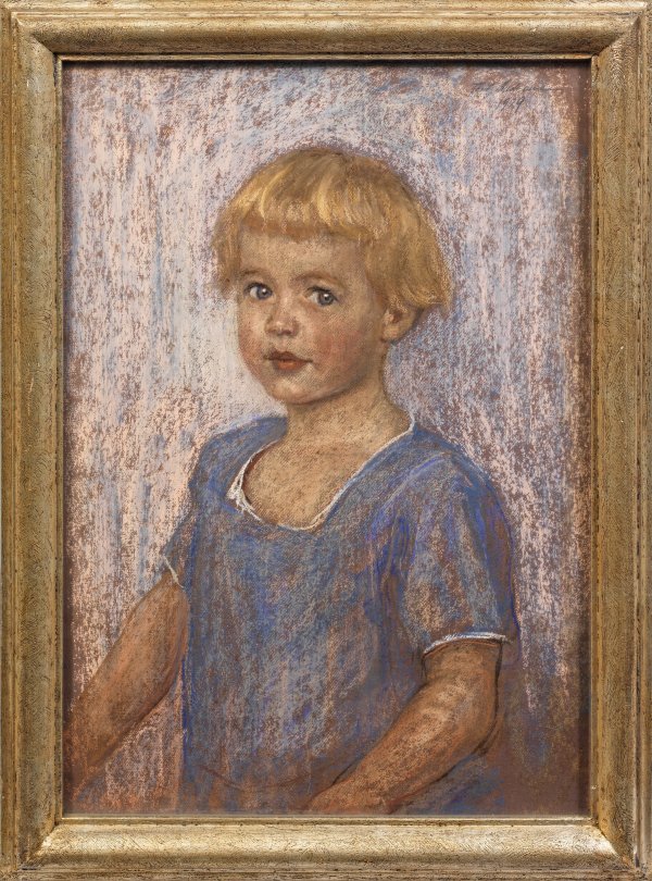 Vor einem hellen, neutralen Hintergrund das halbfigurige Bildnis eines blonden, in hellblau gekleideten Kindes, den Kopf ins Halbprofil gewendet. Feinfühlig charakterisierendes Porträt Mackensens, der 1889 zusammen mit Hans am Ende, Otto Modersohn und Fritz Overbeck Mitbegründer der Worpsweder Künstlerkolonie war, sich jedoch im Unterschied zu diesen Landschaftsmalern vor allem figürlichen Szenen und Bildnissen als Sujets widmete. Pastell/Malkarton. R. o. sign. u. dat. 1929. 66 cm x 47 cm. Rahmen.