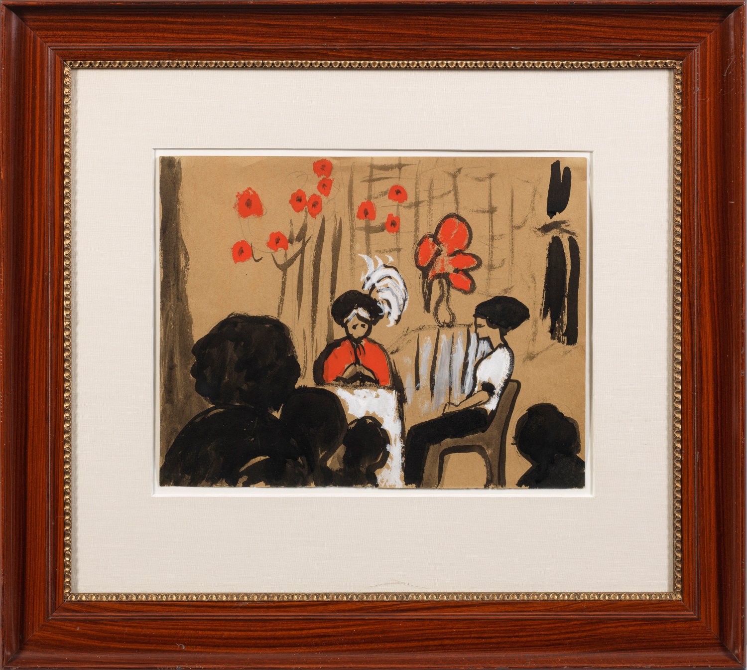 Um 1910 entstandenes Blatt Münters von großer Spontanität, bei der sie große Teile des Papiergrundes frei ließ und höchst effektvolle Rotakzente einsetzte. Die Werke Münters aus den Jahren vor dem Ersten Weltkrieg - die zugleich ein Wendepunkt in der Kunst der Moderne waren - sind die besten ihres Oeuvres. Die Expressionistin war 1903-1914 die Lebensgefährtin von Wassily Kandinsky, 1909 gehörte sie zusammen mit Kandinsky, Alexej Jawlensky, Marianne von Werefkin, Adolf Erbslöh und Alexander Kanoldt zu den Gründungsmitgliedern der "Neuen Künstlervereinigung München" (N.K.V.M.), zu der später auch Franz Marc hinzustieß. 1911 trat sie mit Kandinsky und Marc aus der "Neuen Künstlervereinigung München" aus und beteiligte sich im Winter 1911/12 in München an der ersten legendären Ausstellung des "Blauen Reiters" (mit Werken von ihr, Kandinsky, Marc, Heinrich Campendonk, Robert Delaunay, August Macke und Arnold Schönberg) sowie an allen weiteren Ausstellungen der Gruppe. In der Periode 1908 bis 1914 konnte Münter ihre künstlerischen Stärken - Fähigkeit zur Vereinfachung mit Reduktion der Formen und zeichnerisch treffsichere Malweise mit klaren Farbkontrasten - voll entfalten. Tuschpinsel u. Gouache in Schwarz, Rot, Grau und Deckweiß /hellbraunes Papier. Verso Stempel "NACHLASS GABRIELE MÜNTER". Blatt 28,5 cm x 37,3 cm. Rahmen.
