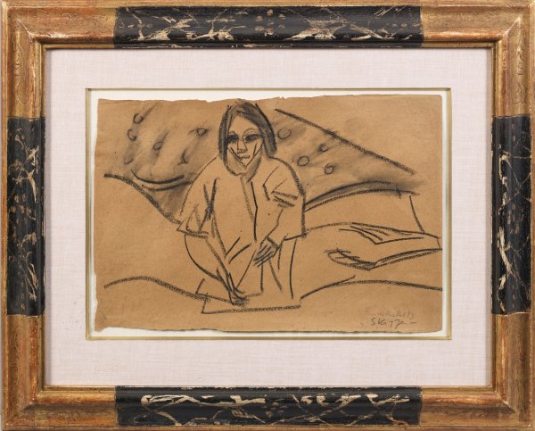 Skizze bzw. Vorstudie zur Mitteltafel des gleichnamigen Triptychons "Genesende" von 1913 (Wvz. Hüneke 1913-15), das sich 1930-1937 im Museum Folkwang Essen befand, seit 1950 im Busch-Reisinger Museum in Cambridge/Massachusetts. Das expressionistische, mit furiosen, breiten Strichen und wenigen Tusche-Akzenten ausgeführte Blatt ist von großer Intimität, nicht allein durch das Sujet, sondern auch durch die Nähe des Künstlers und Betrachters zu der auf einem Bett sitzenden Frau mit ihren tiefen, dunklen Augen. Dargestellt ist Heckels Modell und Lebensgefährtin Sidi Riha, die er 1910 kennengelernt hatte (und 1915 heiratete), in der gemeinsamen Berliner Atelierwohnung. Im Hintergrund ist der afrikanische Rindenstoff, den Heckels Bruder aus Ostafrika mitgebracht hatte, zu sehen. Für Heckel, der zusammen mit Ernst Ludwig Kirchner und Karl Schmidt-Rottluff die Künstlergruppe "Brücke" gegründet hatte, wurden die Berliner Jahre 1911-1914 zu besonders fruchtbaren, glücklichen und bedeutenden in seiner künstlerischen Laufbahn. Er entwickelte einen individuellen Stil und fand zu einem Reichtum künstlerischer Möglichkeiten wie kein anderes Mitglied der "Brücke", die sich 1913 auflöste. Während Kirchner die Momentanität und Hektik des Großstadtlebens malte, richtete sich Heckels Blick in empathischer Weise auf das Individuum - Menschen mit all ihren Sehnsüchten, Freuden, Bedrückungen und Schmerzen. Heckels Bilder ab 1911 sind von einer Melancholie, zunehmenden Psychologisierung und Vergeistigung geprägt. Schwarze Kreide u. Tuschpinsel/Papier. R. u. bez. "Skizze", sign. u. dat. 1913. Blatt 23,5 cm x 34,5 cm. Rahmen.