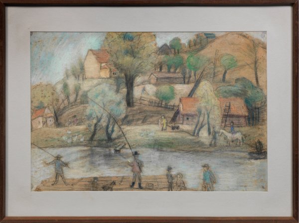 Erzählerische Szene, dessen bewusster naiver Charme Genin mit den Fauves, Malern des "Blauen Reiter" und Chagall verbindet. 1902 studierte Genin an der privaten Malschule von Anton Azbe in München. 1903-1907 verbrachte er u. a. in Paris. 1907 und 1910-1911 stellte er im Salon d'Automne in Paris aus. In München hatte er ab 1911 Kontakt mit Marianne von Werefkin und Alexej Jawlensky und sah Ausstellungen der "Neuen Künstlervereinigung" (N.K.V.M.) und des "Blauen Reiter". Im selben Jahr gehörte Genin mit Paul Klee der Künstlergruppe "Sema" an. 1912 nahm er an der legendären "Sonderbund"-Ausstellung in Köln teil. 1913 wurde Genin Gründungsmitglied der Münchener Neuen Secession. 1918-1929 war Genin in Berlin ansässig, wo ihn Alfred Flechtheim förderte und er 1925-1927 in der Berliner Secession ausstellte. Pastell/Papier. R. u. sign.; 41 cm x 61 cm (Passepartoutausschnitt). Rahmen.