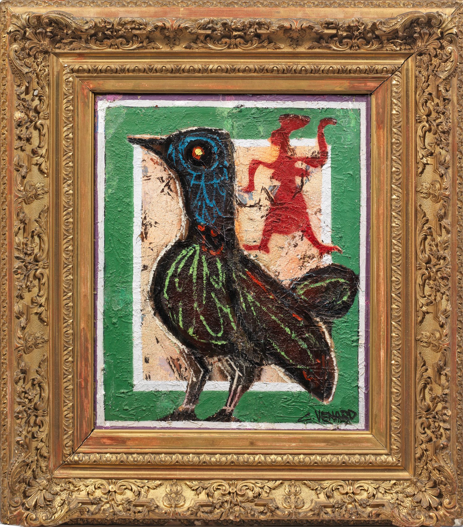 Postkubistische, mit reliefartigem Farbauftrag und harter Konturierung ausgeführte Darstellung eines Vogels und einer archaischen Figur. Venard debütierte 1935 in Paris und beteiligte sich 1936 an der einflussreichen Ausstellung "Forces Nouvelles" von jungen Künstler der Gegenwart. Er nahm an Ausstellungen des Salon des Indépendants sowie am Salon des Tuileries teil und stellte als einer der bedeutendsten Vertreter der École de Paris in der Galerie Charpentier aus. 1943/44 wurde Venard Gründungsmitglied des Salon de Mai, deren Ausstellungen er seit 1945 beschickte. Zu der selben Zeit hatte Venard seine ersten Einzelausstellungen in Paris, seinen Erfolg konnte er auch international fortsetzen - das Metropolitan Museum in New York, die Tate Gallery in London, das Museum für Moderne Kunst in Paris und die Neue Pinakothek in München erwarben Arbeiten Venards. Charakteristisch für den Stil seiner flächigen, teilw. abstrahierenden Kompositionen sind kraftvolle, schwarze Konturen und ein dickes Impasto der Farben, die er teilw. mit dem Spachtel auftrug und mit der harten Pinselspitze bearbeitete. Um 1960 wurde Venard in Sanary-sur-Mer ansässig. Öl/Lwd. R. u. sign.; 65 cm x 53 cm. Rahmen.