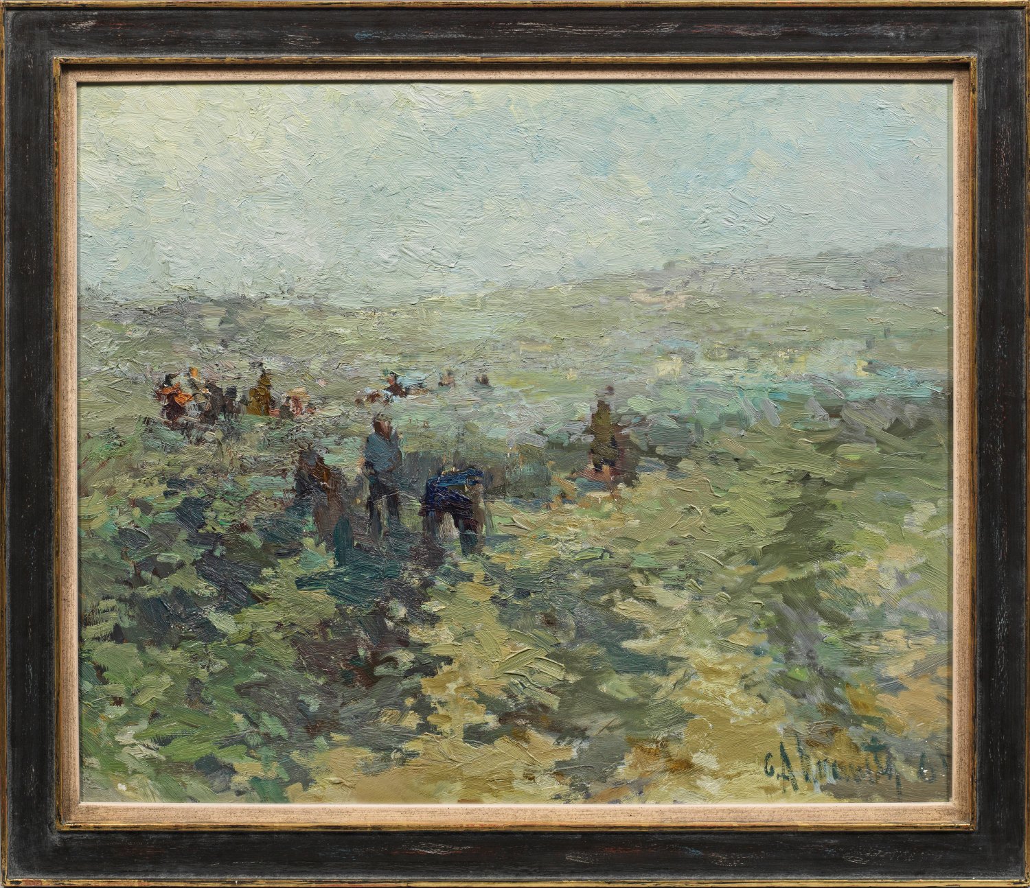 Das mit breitem und flüchtigen Duktus in zartem, pastelltonigem Kolorit gemalte Landschaftsgemälde zeigt den Rebschnitt der Winzer in der Winterzeit. Die Figuren in den Weinbergen wirken schemenhaft und scheinen mit der Landschaft zu verschmelzen. Morawetz hatte in Prag an der Kunstakademie Malerei studiert und siedelte 1959 in die Provence über, wo er sich besonders stilistisch den Bildthemen der Landschaftsmalerei des Impressionismus zuwandte. Öl/Hartfaser.; R. u. sign.; Verso Etikett vom Salon d'art Moderne Paris bez. u. betitelt. 60 cm x 74 cm. Rahmen.