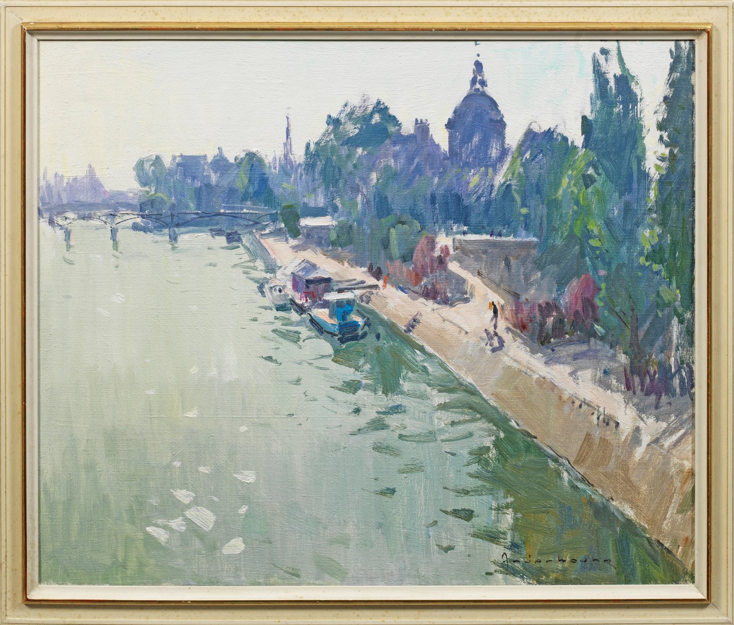 Paris-Ansicht aus der Vogelperspektive, die Anderbouhr mit sehr breitem und schnellem Duktus in zartem, pastelltonigem Kolorit einfängt. Motiv- und stiltypisches Werk Anderbouhrs, in dessen Oeuvre Paris-Motive ein Hauptsujet darstellen. Öl/Lwd.; R. u. sign.; Verso auf einem Etikett eigenhändig bez. u. betitelt. 60 cm x 73 cm. Rahmen.