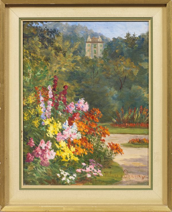 Über ein farbenprächtiges Meer von Sommerblumen, die einen Weg im Schlosspark säumen, gleitet der Blick auf eine bewaldete Anhöhe mit Lustschloss. Die Salzburger Künstlerin schuf zahlreiche intime Ansichten aus dem Park von Hellbrunn. Öl/Hartfaser. R. u. sign. und bez.: Hellbrunn. 38 cm x 30 cm. Rahmen.