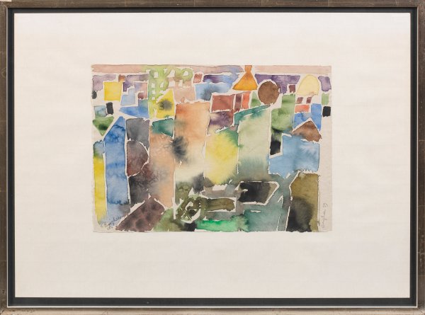 Das 1959 entstandene Blatt spiegelt mit seiner lichten Farbigkeit und der flächigen, mosaikhaften Abstraktion die Auseinandersetzung Bargheers mit der Moderne - besonders mit Paul Klee und dessen Tunis-Reise im Jahr 1914 - wider. Bargheer hatte Klee, der 1921-1931 als Meister am Bauhaus gewirkt hatte, 1935/36 bei Besuchen in der Schweiz kennengelernt und dürfte zugleich 1935 die Klee-Retrospektive in der Kunsthalle Bern gesehen haben. Aquarell/Papier. R. u. sowie l. u. sign. u. dat. (19)59. 32,5 cm x 22,5 cm. Rahmen.