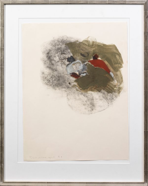 Das Oeuvre Krawagnas steht in der Tradition des Informel, das er durch sein Studium 1963/64 an der École des Beaux-Arts in Paris unmittelbar kennenlernen konnte. In seinen abstrakten bzw. assoziativen Arbeiten wie bei diesem Blatt setzt er in sparsamer Weise und subtil gewichtend kalligraphische bzw. zeichenhafte, formelhafte Elemente ein, wobei er eine reduzierte Farbigkeit bevorzugt. Mischtechnik/Papier. L. u. sign. u. dat. (19)94. Blatt 65 cm x 50 cm. Rahmen.