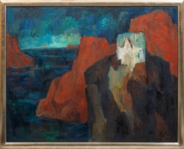 Großformatige, flächig komponierte, sich der Abstraktion nähernde Landschaft Kohlstädts, der 1946-1948 seine künstlerische Ausbildung bei Walter Romberg und Rudolf Müller in Stuttgart erhielt. Prägend für Kohlstädts Oeuvre wurden die Werke der Expressionisten, Edvard Munchs, Lovis Corinths und der Fauvisten, die nach der NS-Zeit wieder zugänglich waren. 1958 gründete er als Abspaltung des Stuttgarter Künstlerbundes die "Sindelfinger Sezession", seit Ende der 1950er Jahre hatte er zahlreiche Einzelausstellungen. Auf Studienreisen faszinierten den späten Landschaftsexpressionisten insbesondere die rauen Küsten Norwegens, der Normandie und Bretagne. Öl/Lwd.; R. u. sign. u. dat. (19)71; 110 cm x 140 cm. Rahmen.