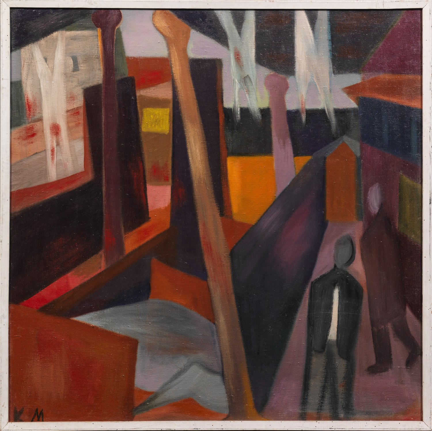 Von der Decke hängend blutverschmierte Kleidungsstücke, während zwei Männer ohne Gesicht vorbeigehen. In dekonstruktiver Manier werden Räume durch Differenzierungen von Farben und Flächen zerlegt. Meirowsky studierte 1938-1942 an der Berliner Hochschule der Künste und schloss sich der Widerstandsgruppe "Rote Kapelle" an. 1949 Gründung des Malerkabarett "Die Badewanne". Von 1953 bis kurz vor ihrem Tod lebte sie auf Ibiza, wo sie in der Galerie Mace ausstellte. Acryl/Leinwand. Monogr., verso Sign. und dat. 96 cm x 96 cm. Rahmen.