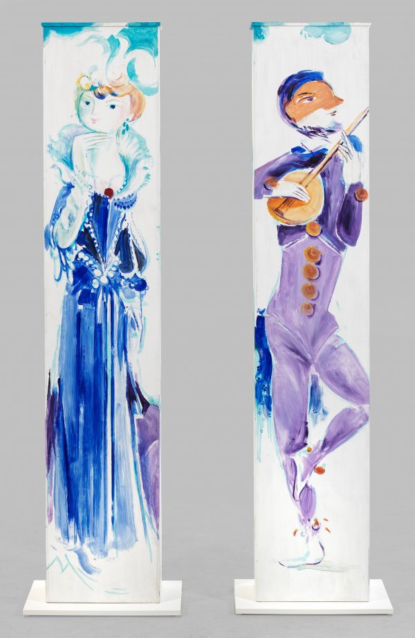 In hell leuchtendem Kolorit gemalte, phantasievolle, stilisierte Darstellungen einer Dame bzw. eines musizierenden, maskierten Harlekins, rücks. ein Parkbrunnen. Werner wirkte als Maler, Grafiker und Porzellan-Künstler prägend auf die Entwicklung der Meissener Manufaktur in der 2. Hälfte des 20. Jhs.; 1957 wurde er Dekorgestalter in Meissen, 1960 gründete er zusammen mit Ludwig Zepner und Peter Strang dort das "Kollektiv Künstlerische Entwicklung". Im Laufe seiner Tätigkeit entwarf Werner ca. 100 moderne Meissen-Dekore wie "1001 Nacht" und "Sommernachtstraum". Überdies schuf er zahlreiche Meissen-Unikate und Porzellan-Wandbilder an und in öffenlichen Gebäuden. Ab 1978 lehrte Werner auch als Professor an der Hochschule für Kunst und Design Burg Giebichenstein bei Halle (Saale). Acryl auf weiß gefassten Holz- bzw. MDF-Pfeilern. Jeweils sign. u. dat. 2002. H. 204 cm. Plinthe 55,5 cm x 34 cm.