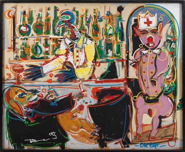 Szene mit einem Schwein in Krankenschwesternkostüm, hinter der die Figur eines Bischofs steht, auf der linken Bildseite ein Schwein in dunklem Anzug mit erhobenem Glas, der Barkeeper in Gestalt eines Geiers oder Adlers. Mit kraftvollem, furiosem Duktus gemalte, neoexpressionistische Arbeit Markus Tollmanns, der Schüler seines Vaters Günter Tollmann war und mit Francis Bacon zusammenarbeitete. Der Stil, die Darstellung mit Tieren und der Titel lassen darauf schließen, dass Tollmann hiermit die um 1980 entstandene Kunst der "Jungen Wilden" bzw. "Neuen Wilden" ironisch persiflierte - insbesondere die "Café Deutschland"-Werkreihe von Jörg Immendorf. Acryl/Karton, auf Holztafel kaschiert. L. u. sign. u. dat. (20)05. R. u. betitelt. 210 x 260 cm. Rahmen.