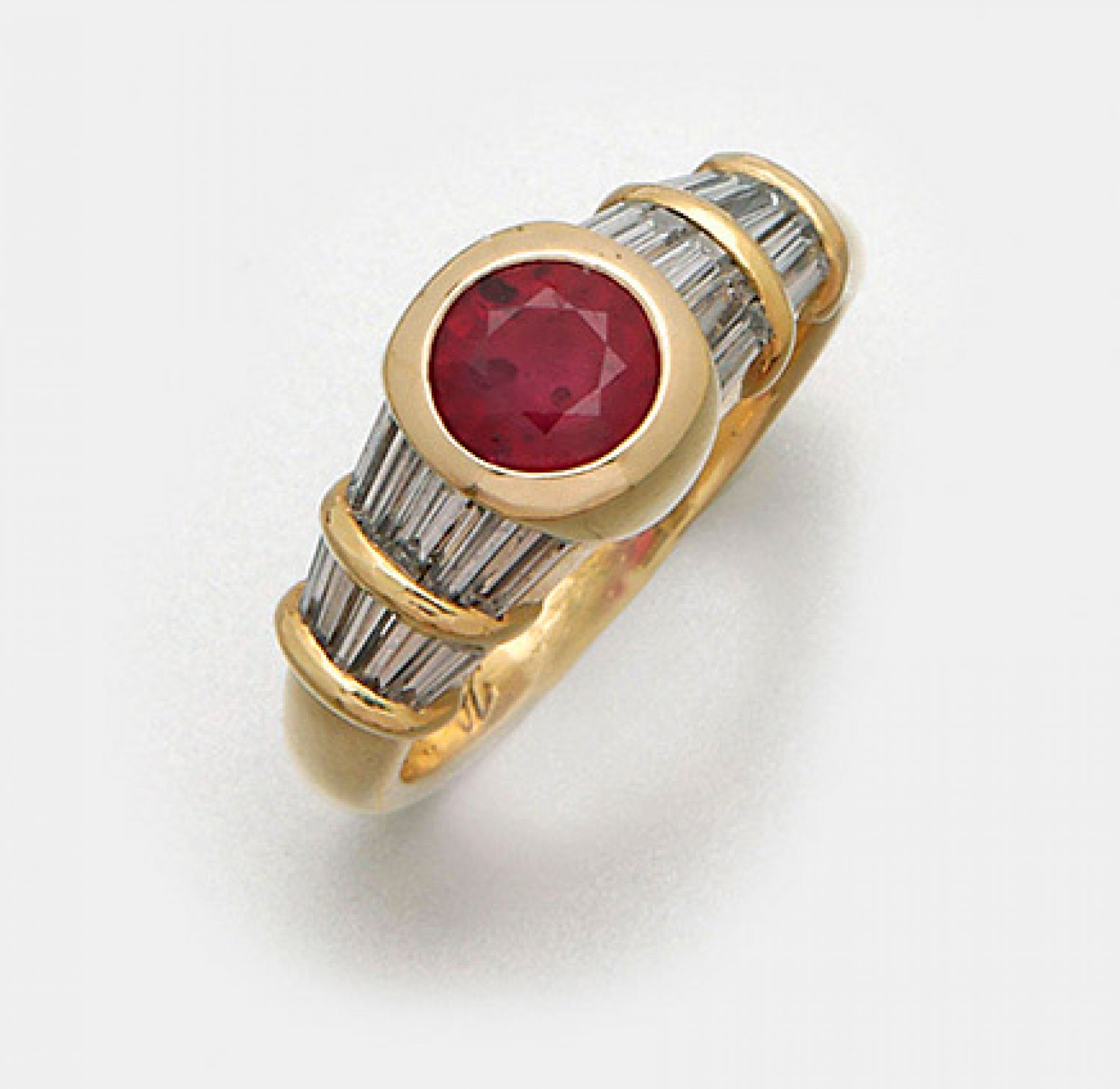 Dekorativer Rubinring von Juwelier Kröner, Hannover Gelbgold, gest. 750. Zentral besetzt mit einem taubenblutroten Rubin von ca. 1,00 ct., flankiert mi Diamanten von ca. 1,00 ct. (H/si). Gew. ca. 8,18 g.