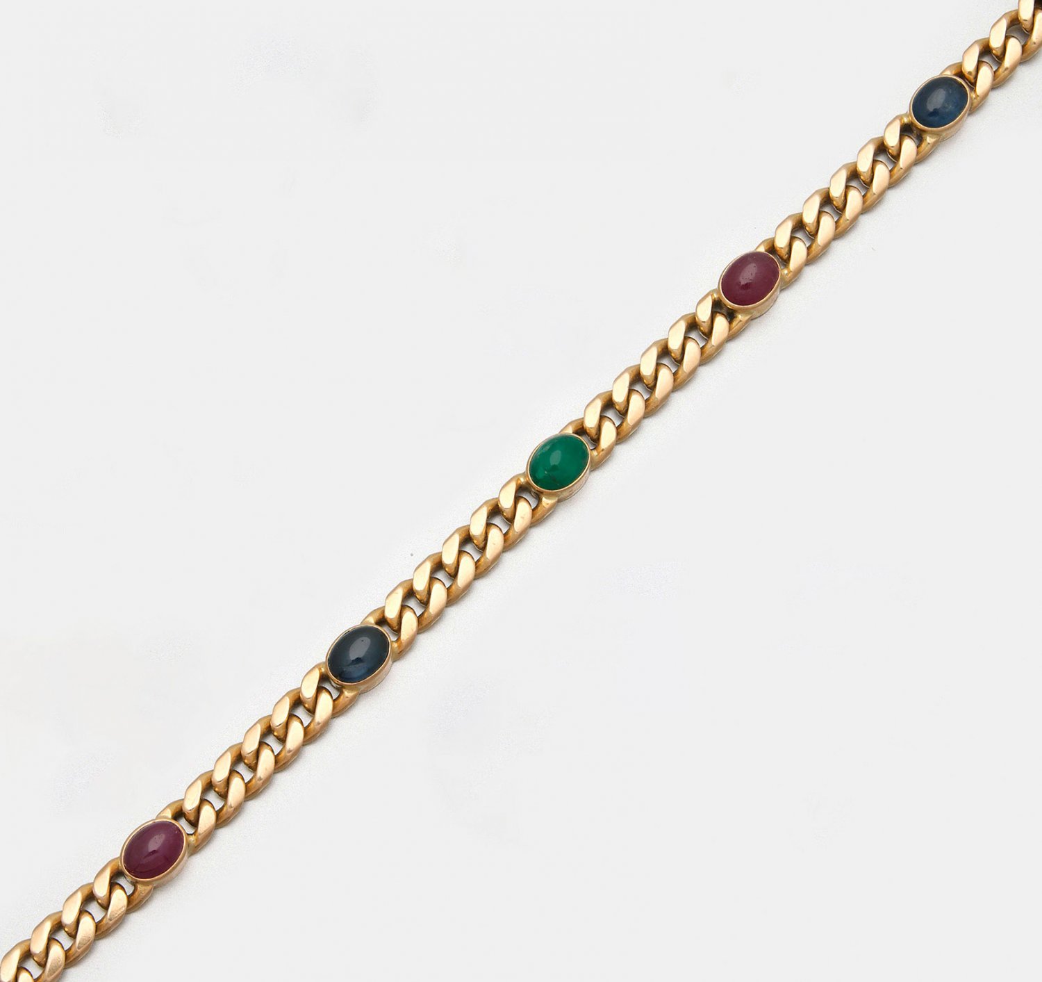 Klassisches Multicolor-Armband Gelbgold, gest. 585. Flachpanzerarmband, schauseitig besetzt mit Saphiren, Rubinen und Smaragden im Cabochonschliff. Gew. 28,75 g.