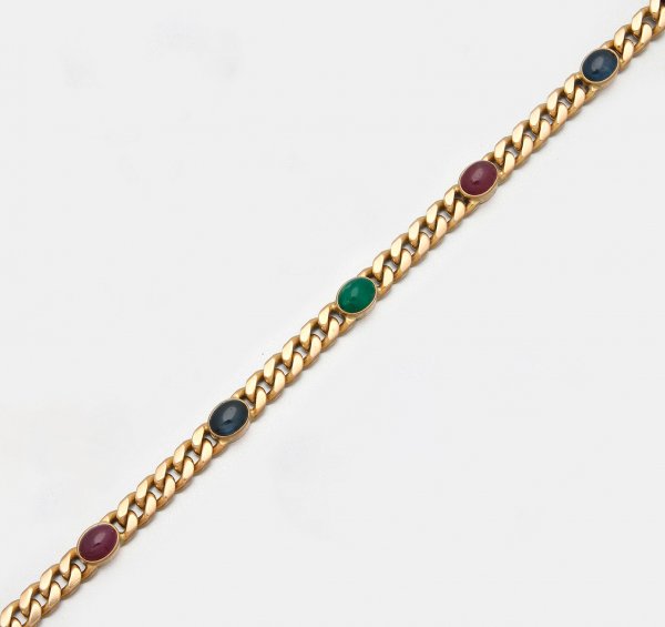 A bracelet set with rubies, sapphires and emeralds, in 14 k gold.