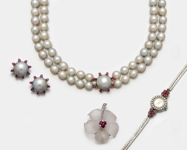 Elegantes Rubin-Perlparure der 50er Jahre Weißgold, gest. 585. Zweireihiges Collier aus hellgrauen Zuchtperlen in sehr farbintensivem Lüster von ca. 8,2 mm. Korrespondierendes Paar Perl-Ohrclips mit Rubinen besetzt sowie Blüten-Brosche und Armbanduhr.
