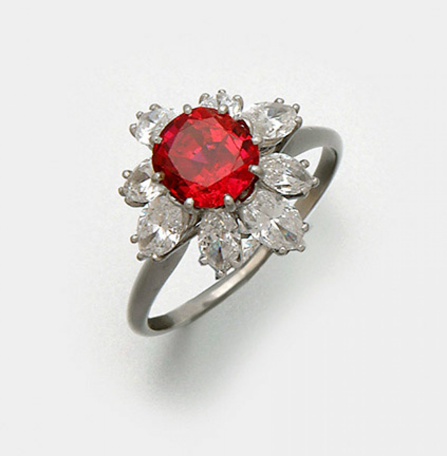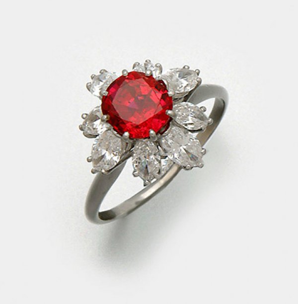 Hochfeiner Rubin-Diamantring Platin. Zentral besetzt mit einem taubenblutroten, transparenten Rubin von ca. 2,10 ct., umrahmt von acht Diamantnavetten von zus. ca. 1,67 ct. (H/si-pi). Gew. 5,07 g.