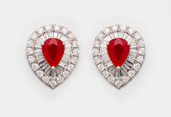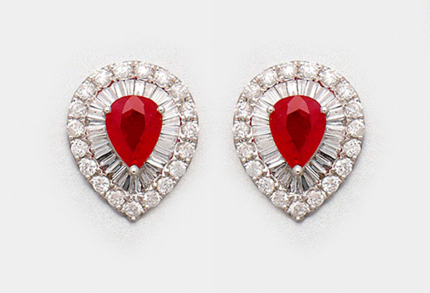 Paar hochfeine Rubinohrringe Weißgold, gest. 750. Schauseitig besetzt mit zwei taubenblutroten Rubinen im Pendeloqueschliff von zus. ca. 3,10 ct. und Brillanten sowie Diamantbaguetten von zus. ca. 0,96 ct. (F-H/vs). Ges.-Gew. ca. 3,86 g.