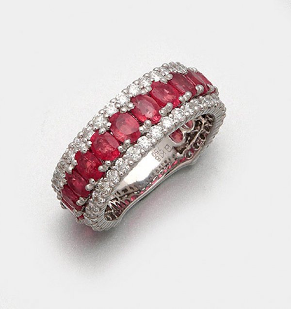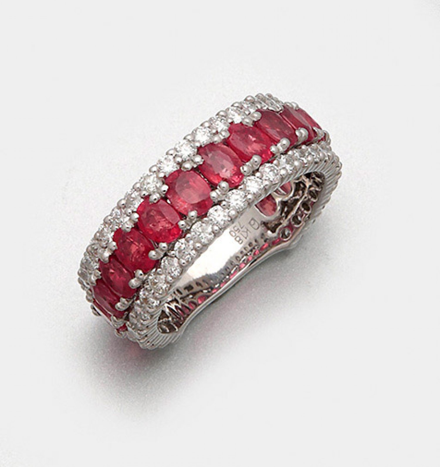 Hochfeiner Rubin-Bandring Weißgold, gest. 750. Umlaufend besetzt mit taubenblutroten Rubinen im Ovalschliff von zus. ca. 3,36 ct., entouriert von Brillanten von zus. ca. 1,35 ct. (F-G/vs). Gew. ca. 7,04 g.