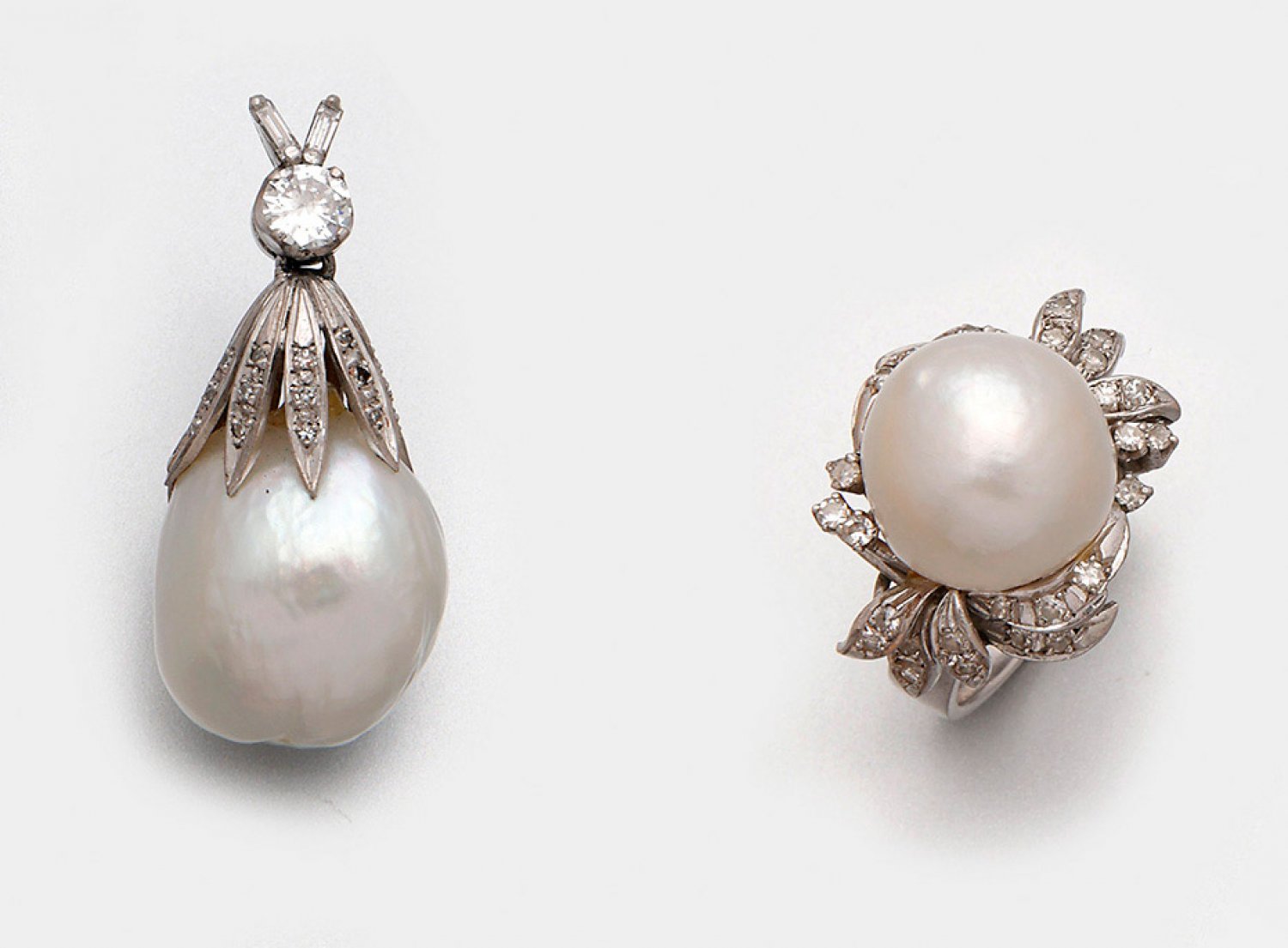 Barockperlen-Demi Parure Weißgold, gest. 14 ct.; Ring und korrespondierender Anhänger, besetzt mit jeweils einer weißen Barockperle in sehr feinem rosé-grün changierendem Lüster, akzentuiert durch Diamanten von zus. ca. 0,60 ct. und einem Altschliffdiamanten von ca. 0,35 ct. (I-J/vs).