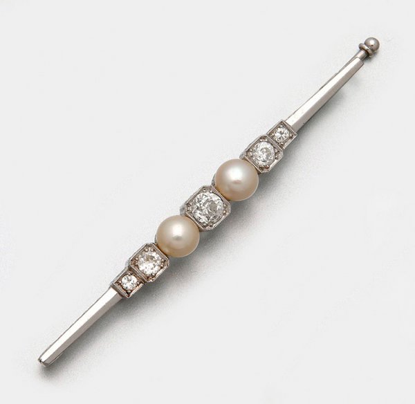 Art Déco-Stabnadel 14 ct. Weißgold. Schauseitig besetzt mit zwei cremefarbenen Perlen von ca. 5,7 mm in sehr farbintensivem rose-grün changierendem Lüster sowie Altschliffdiamanten von zus. ca. 0,60 ct.; Gew. ca. 7,81 g.