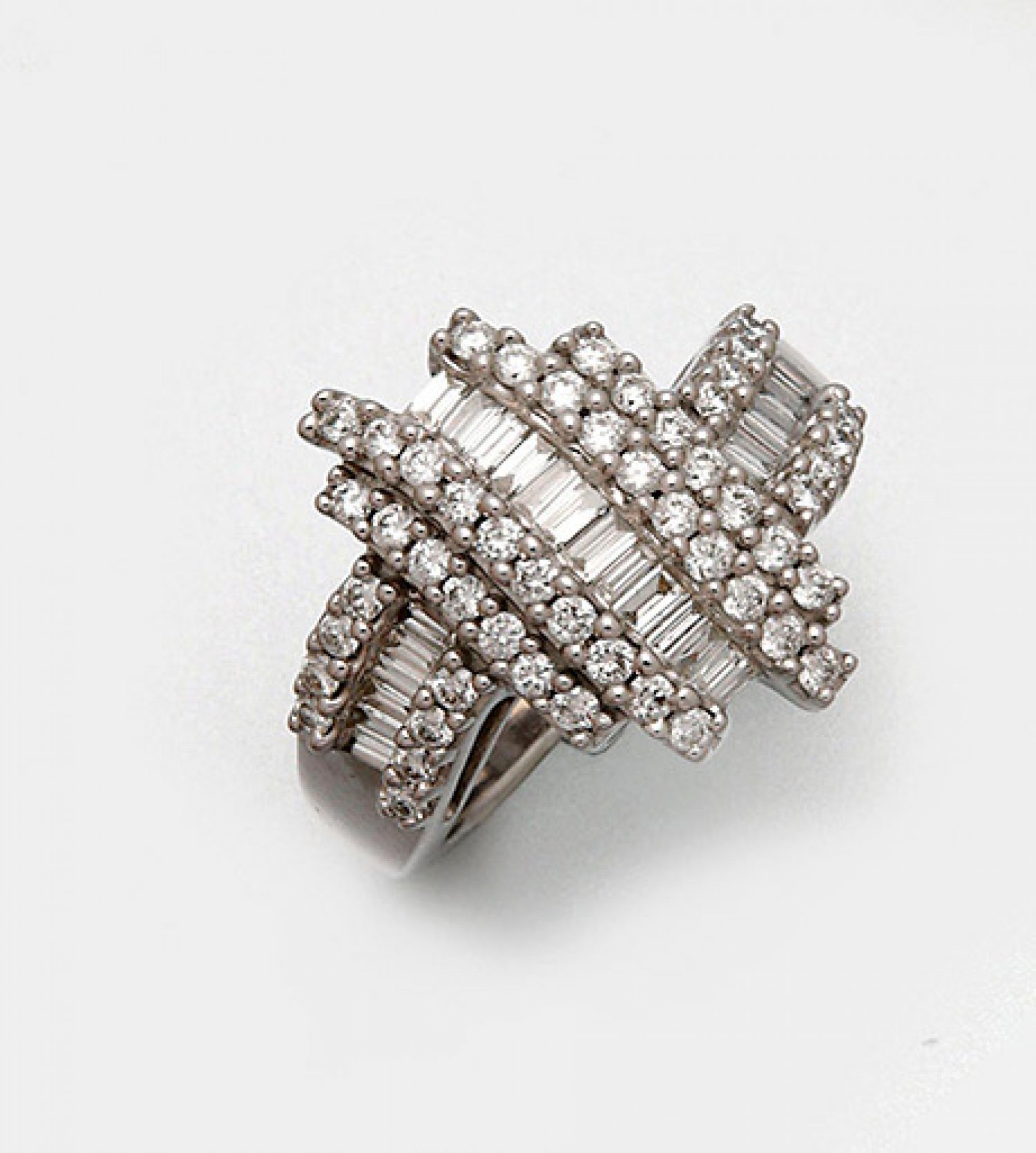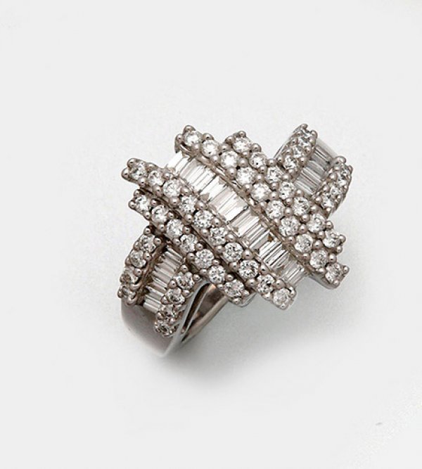 Dekorativer Diamantring Weißgold, gest. 750. Schauseitig besetzt mit Diamantbaguetten und Brillanten von zus. ca. 1,70 ct. (H/vs-si). Gew. ca. 8,47 g.