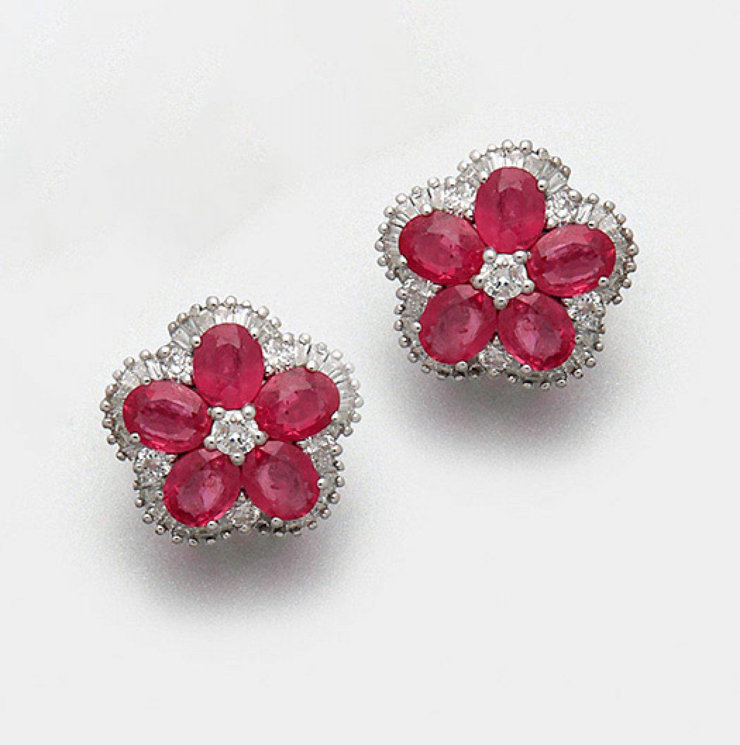 A pair of earrings set with pigeon blood red rubies approx. 3,00 ct. and diamonds approx. 0,86 ct. (H/vs), in 18 k white gold.
