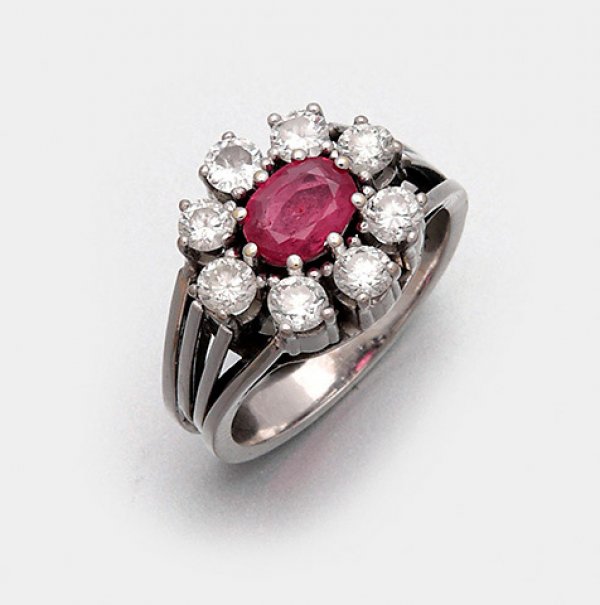 Klassischer Rubin-Brillantring Weißgold, gest. 585. Zentral besetzt mit einem taubenblutroten Rubin von ca. 1,00 ct., entouriert mit Diamanten von 0,80 ct. (I-J/si-pi). Gew. ca. 6,99 g.