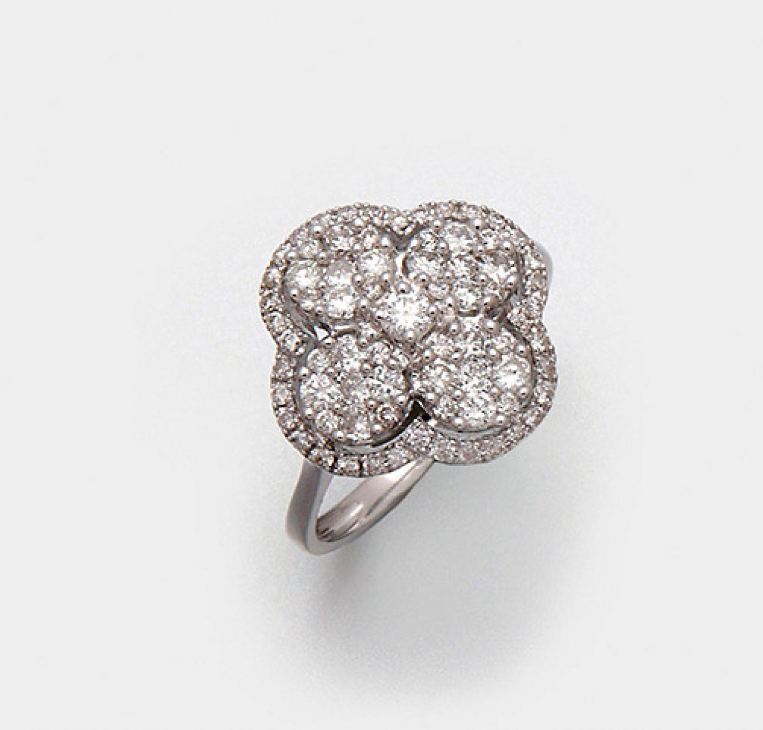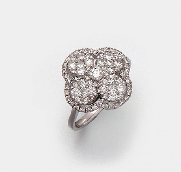 Hochfeiner Brillantring Weißgold, gest. 750. Schauseitig besetzt mit Brillanten von zus. ca. 0,94 ct. (F-G/vs), angeordnet in Form eines vierblättrigen Kleeblatt. Gew. ca. 3,52 g.