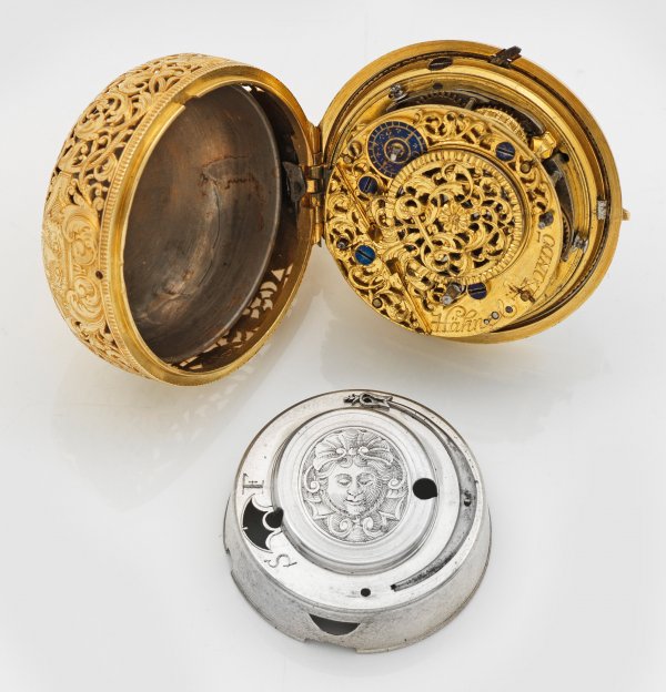 Seltene Gold-Spindeluhr mit Repetition von C. H. Hähnel England. London. Um 1740. 18 ct. Gold und vergoldetes Messing. Vierfaches Gehäuse außen mit Haifischhaut überzogen, getrieben und graviert, teilw. in Ajour, äußerst feiner, flächendeckender, teilw. erhabener Reliefdekor aus stilisierter Parklandschaft mit musizierendem tanzenden Paar in szenischer Darstellung, umrahmt von Reserven. Darin Attribute der Musik, der Liebe, der Gärtnerei, Blattranken, Chimären, Maskarons, Jagdszenerien und Lambrequins. Vergoldetes Werk mit Schlüsselaufzug, Schnecke und Kette. Emailzifferblatt mit schwarzen römischen Stunden und Minuterie, Louis-XV.-Zeiger. Schlüssel nicht vorhanden. Ges.-Gew. ca. 138,03 g.