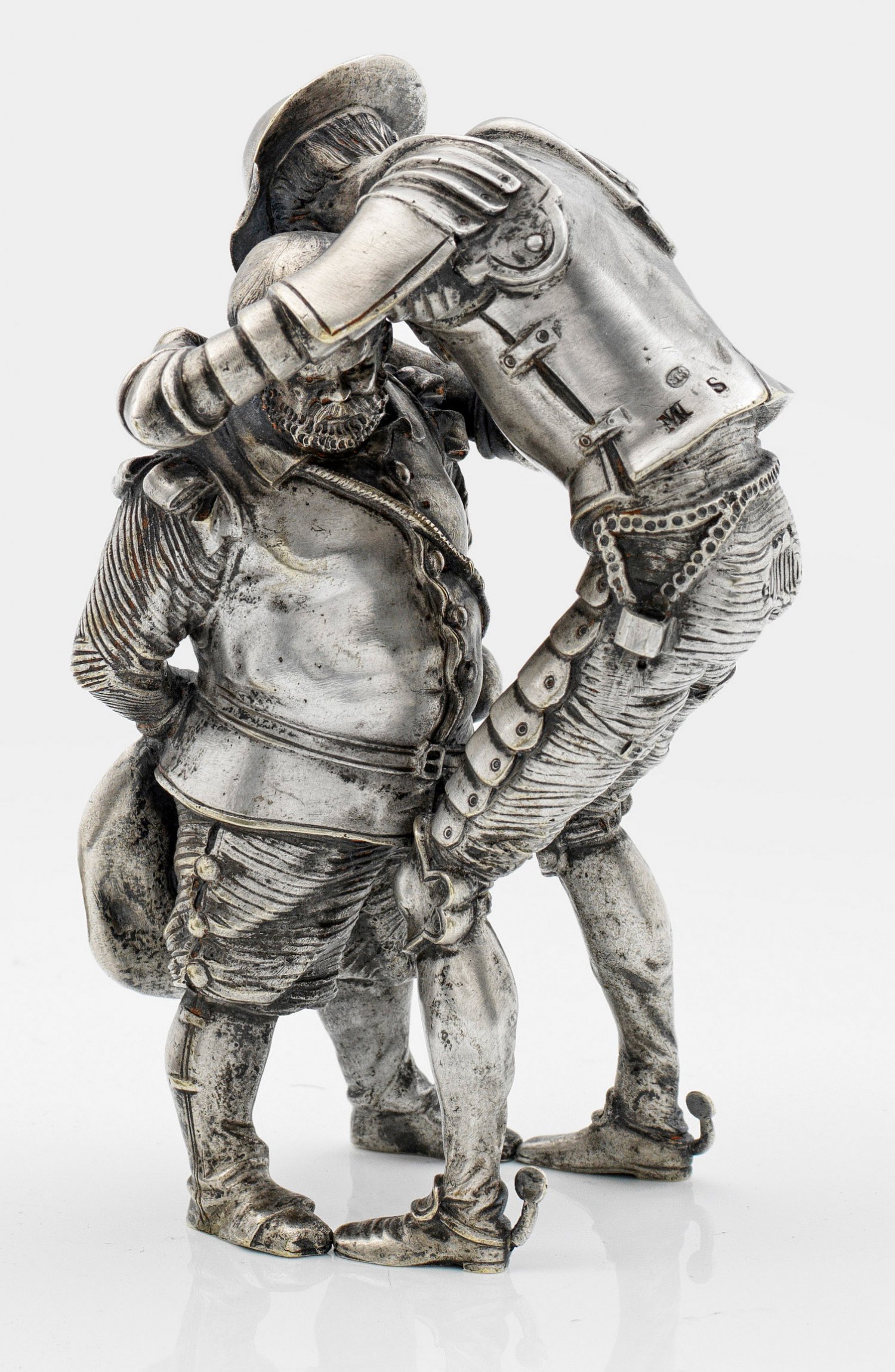 Figurengruppe "Don Quijote und Sancho Panza" Silber. Vollplastische Darstellung Don Quijotes als hochgewachsener, schlanker Ritter, der sich zu seinem kleinen, beleibten Schildknappen Sancho Panza hinunterbeugt und ihn umarmt. Sehr feine, detailreiche Wiedergabe der Figuren als skulpturale Illustration des 1605-1615 erschienenen, berühmten Romans von Miguel de Cervantes. Gest. 813 und Monogr.-Stempel "M"(?) und "S". H. 13 cm.