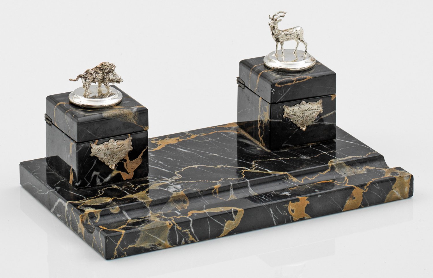 Schreibzeug mit Tierfiguren Schwarzer, ockerfarben und weiß geäderter Marmor. Kubische, scharnierte Tintenfässer mit vollplastischen, silbernen Tierfiguren eines Rothirschen und eines Wildschweins, schauseitig zwei silberne Plaketten mit gravierter Widmungsinschrift und Ortsangabe Diepoldsau. H. 12,5 cm. 26 cm x 16 cm.