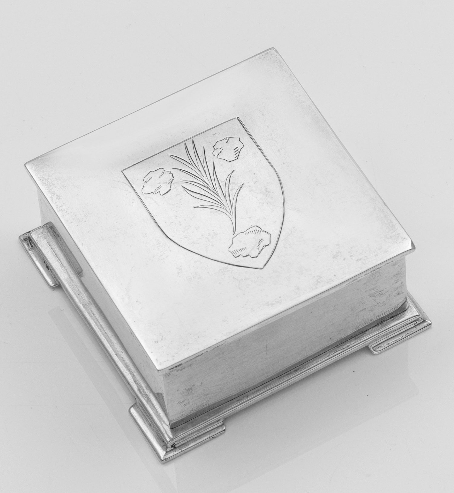 Schmuckschatulle Silber. Quadratisch. Leicht gewölbter Deckel mit graviertem Wappenschild. Innen vergoldet. Gest. 925 Sterling. Beschaumarke, Herstellerzeichen. Gew. ca. 280 g. H. 4 cm x 9 cm x 9 cm.