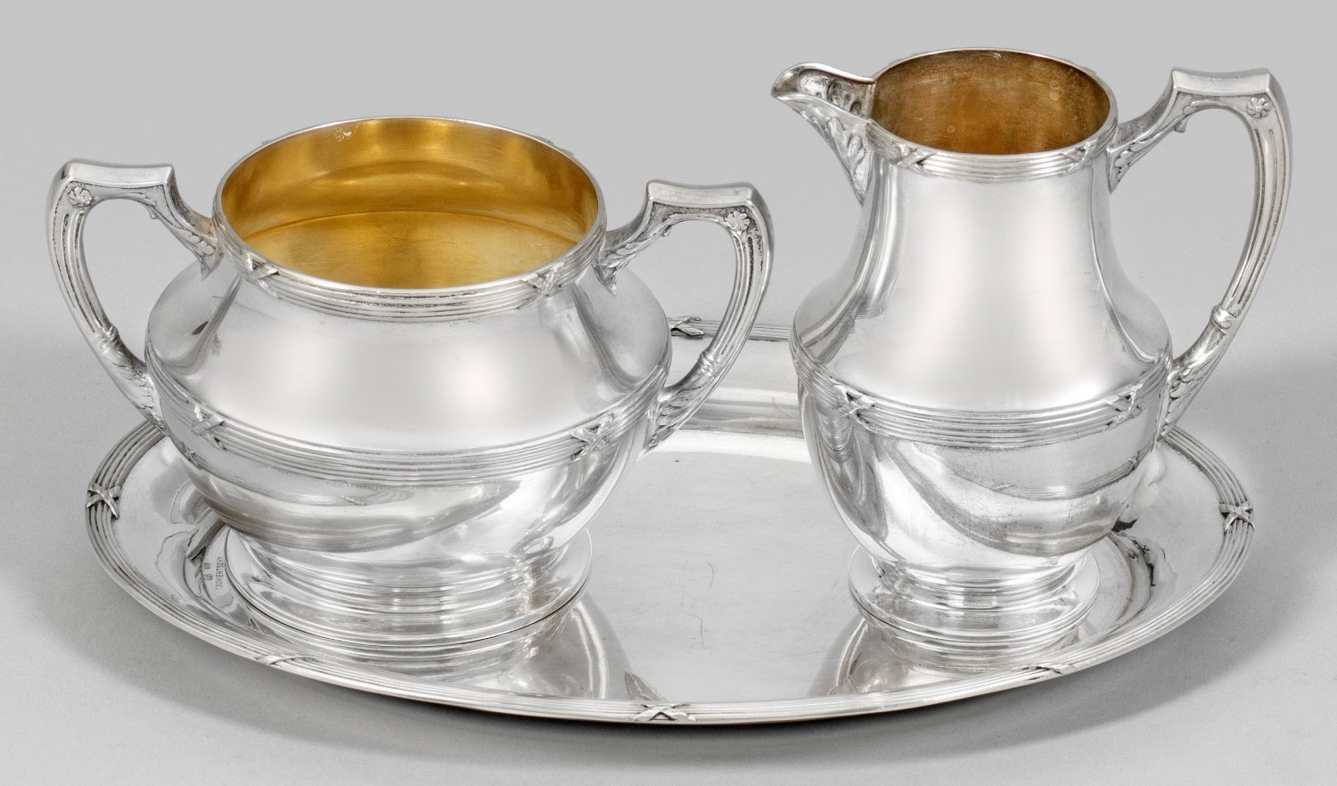 Jugendstil-Zucker und Sahne-Set 3-tlg.; Silber, teilvergoldet. Glatte Form mit dezenten Riefen-Kreuzband-Profilen und floral reliefierten Handhaben. Gest. 800, Herstellerzeichen, Vertriebsstempel "Tschientschy". Gew. ca. 490 g. B. 22,5 cm.