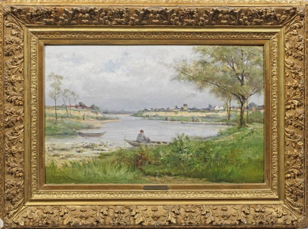 In hellem, pastelltonigem Kolorit gemalte Landschaft, das den Einfluss der Schule von Barbizon, insbesondere von Camille Corot auf Langerock widerspiegelt. Öl/Lwd., auf Eichenholztafel kaschiert. L. u. sign.; 50 cm x 80 cm. Rahmen.
