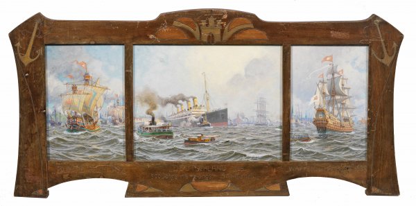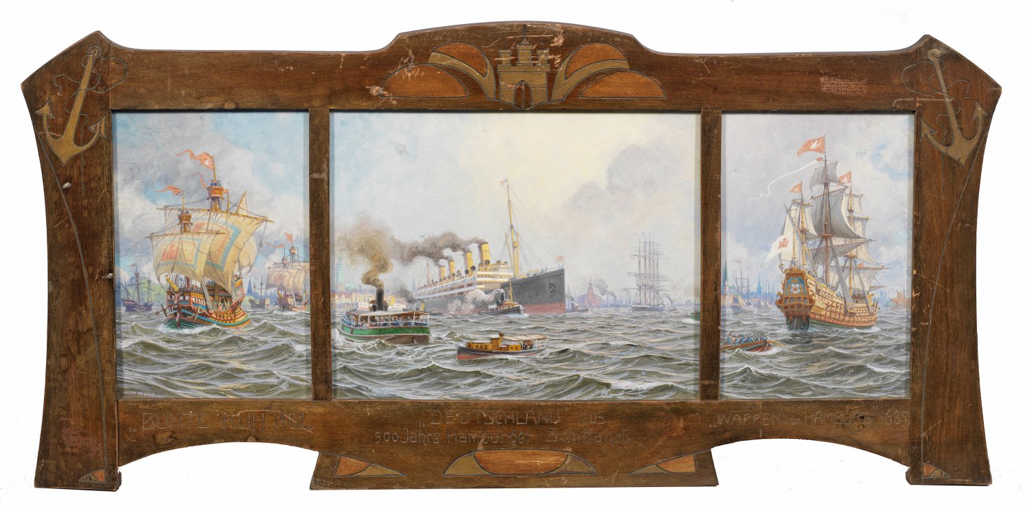 Im Mittelbild moderne Hafenansicht mit dem Dampfer "Deutschland", links und rechts die historischen Schiffe "Bunte Kuh" und "Wappen von Hamburg". Feines, koloristisch gut durchgearbeitetes Werk des in Hamburg tätigen Marinemalers Gleich, der an den Akademien in Königsberg, München und Düsseldorf studierte. Gouache/Papier. L. u. sign.; Ges.-Größe 34 cm x 70 cm. Originaler Jugendstilrahmen.