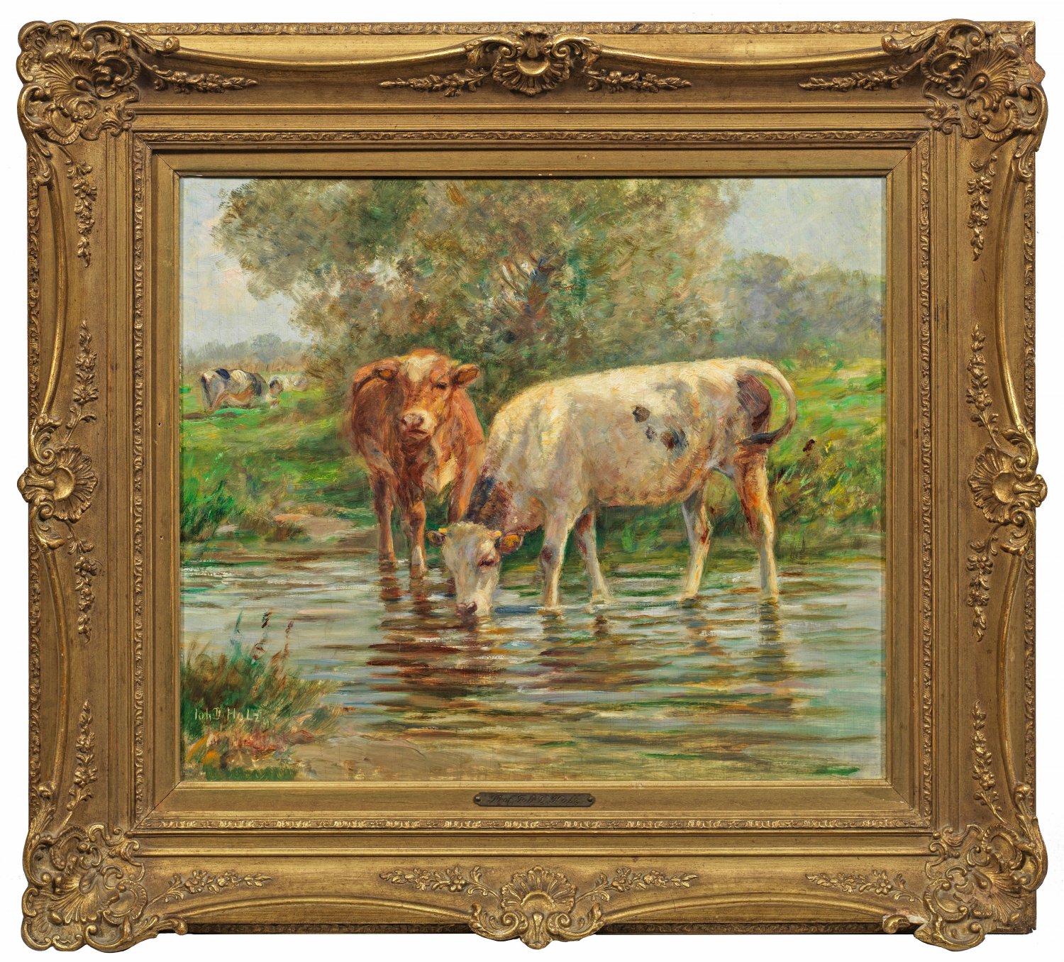 Typisches, spontan und lebensnah aufgefasstes Werk in hellen Sommerfarben des Tier- und Landschaftsmalers, der bevorzugt Kühe am Wasser oder mit Hirtin darstellte. Holz war Mitglied der Luitpold-Gruppe und wird der Münchner Malerschule zugerechnet. Öl/Holz. L. u. sign.; 38,5 x 45 cm. Rahmen.